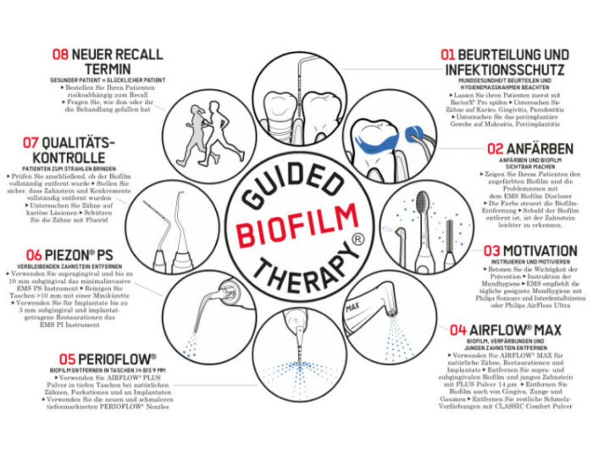 Die Instruktion und Motivation zur häuslichen Mundhygiene, einem der acht Behandlungsschritte der Guided Biofilm Therapy, ist deshalb neben der professionellen Prophylaxe ein wesentlicher Erfolgsbaustein für orale Gesundheit. Das evidenzbasierte GBT-Konzept unterscheidet sich von den klassischen Ablaufprotokollen einer Prophylaxe-Sitzung durch folgende Änderungen: Anfärben, zuerst supra- und subgingivale Biofilmentfernung mit AIRFLOW® und PERIOFLOW® und PLUS Pulver, dann gezielte Entfernung von harten Ablagerungen mit PIEZON® PS Instrument und kein Polieren.